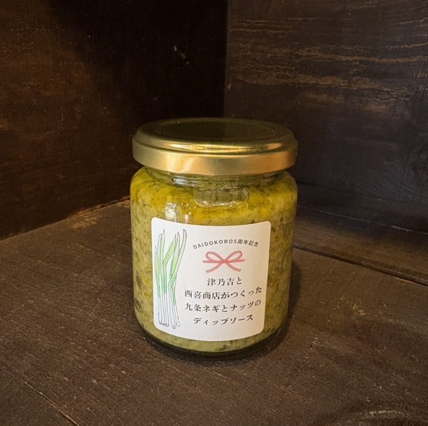 さらに今回新たなプロジェクトとして、西喜商店オリジナルの商品開発にも取り組みました。野菜をより美味しく食べるためのソースを作りたい。この思いに応えてくれたのが、日頃より懇意にしていただいている東山五条の京佃煮屋「津乃吉」さんです。私が最も好きな野菜である九条ネギをベースに、グリル野菜を引き立たせるソースが欲しい―その思いに満額回答の最高のディップソースが完成しました。